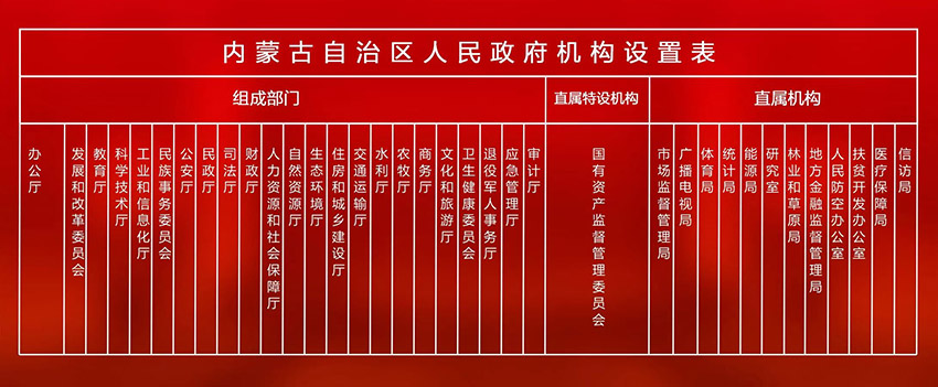 內(nèi)蒙古自治區(qū)人民政府設(shè)置工作部門36個(gè)。其中,辦公廳和組成部門23個(gè),直屬特設(shè)機(jī)構(gòu)1個(gè),直屬機(jī)構(gòu)12個(gè)。民族事務(wù)委員會(huì)掛蒙古語(yǔ)文工作委員會(huì)牌子;研究室掛參事室牌子;市場(chǎng)監(jiān)督管理局掛知識(shí)產(chǎn)權(quán)局牌子;地方金融監(jiān)督管理局掛政府金融工作辦公室牌子;政府外事辦公室與自治區(qū)黨委外事工作委員會(huì)辦公室合署辦公,不計(jì)入機(jī)構(gòu)限額。醫(yī)療保障局規(guī)格為副廳級(jí)。