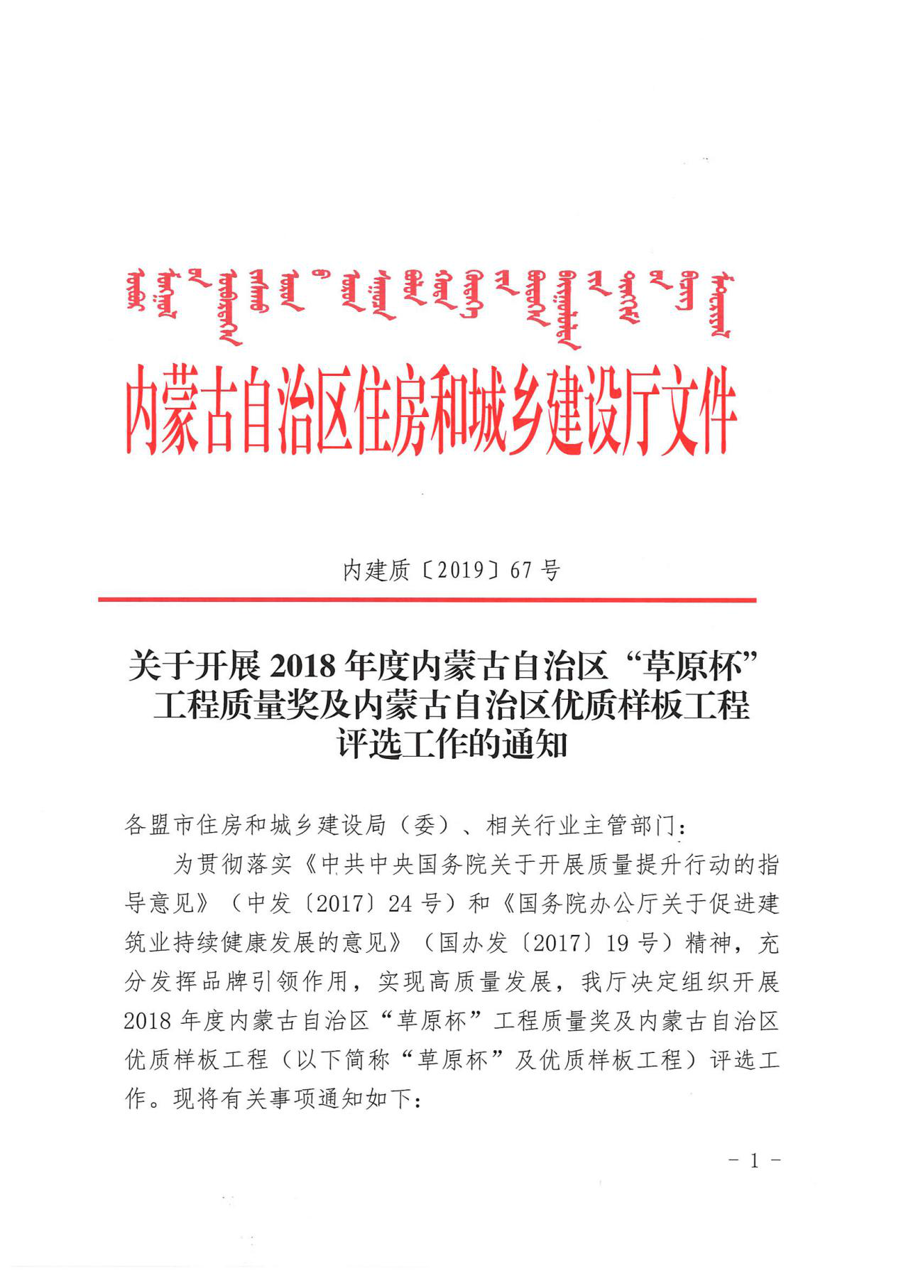 關于開展2018年度內(nèi)蒙古自治區(qū)“草原杯”工程質(zhì)量獎及內(nèi)蒙古自治區(qū)優(yōu)質(zhì)樣板工程評選工作的通知