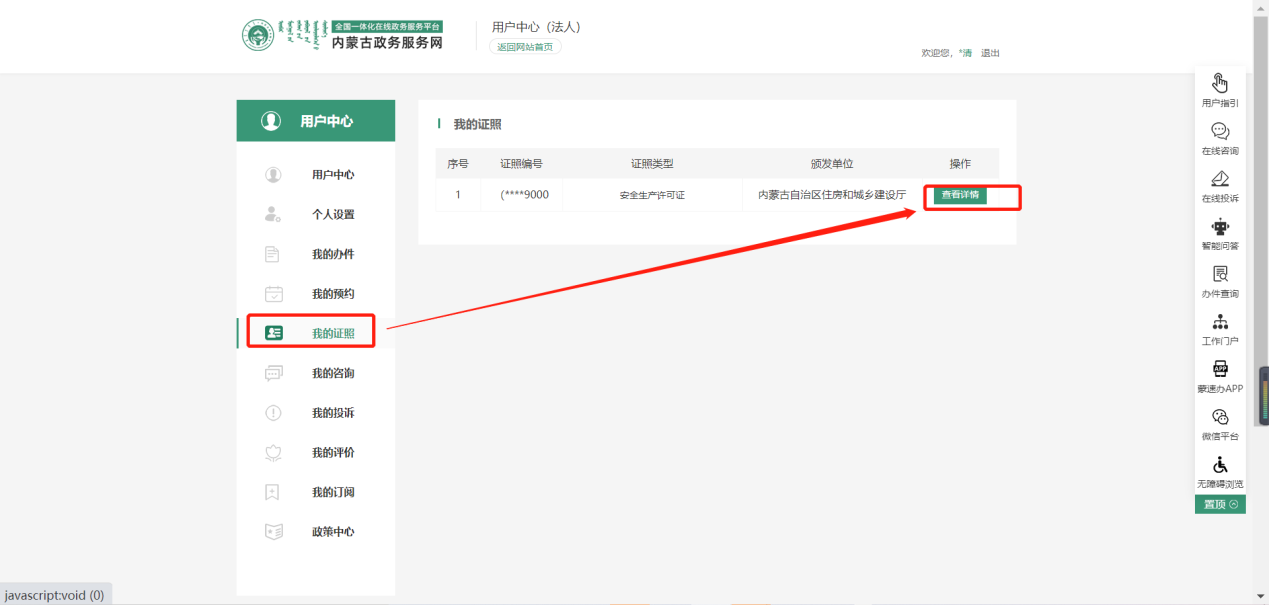 依次點(diǎn)擊我的證照、查看詳情;