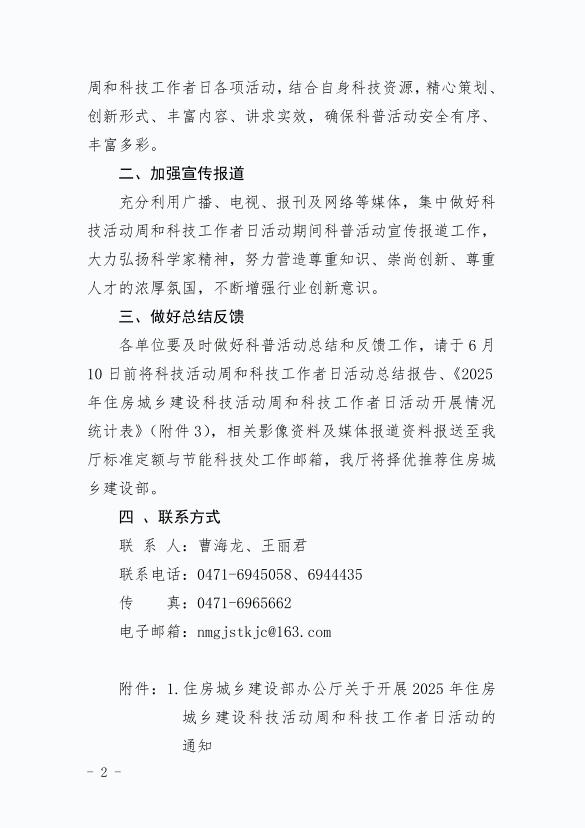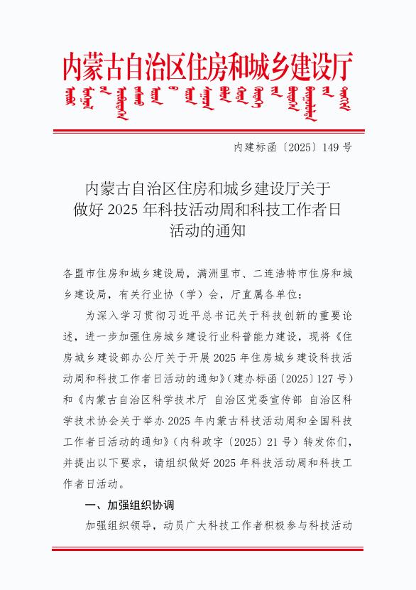 內(nèi)蒙古自治區(qū)住房和城鄉(xiāng)建設廳關(guān)于做好2025年科技活動周和科技工作者日活動的通知